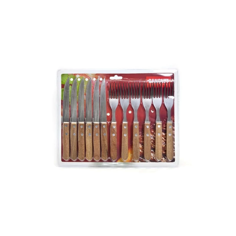 12r. steak evőeszköz szett Party Blistr 12 részes PARTY steak szett, fanyelű steak evőeszközök, a hús könnyű szeletelése végett a penge éle fogazott. Négyágú villa vastagsága 1,5 mm, kés vastagsága 1,2 mm, nyél vastagsága 1 cm, hosszúság 19,6 cm, rozsdamentes acél 18 / 0. A steak evőeszközök nem csak otthon, de kerti partikon és grillezéskor is használhatók. A kés fogazott pengéje bármilyen hússal könnyen megbirkózik. Méretek: