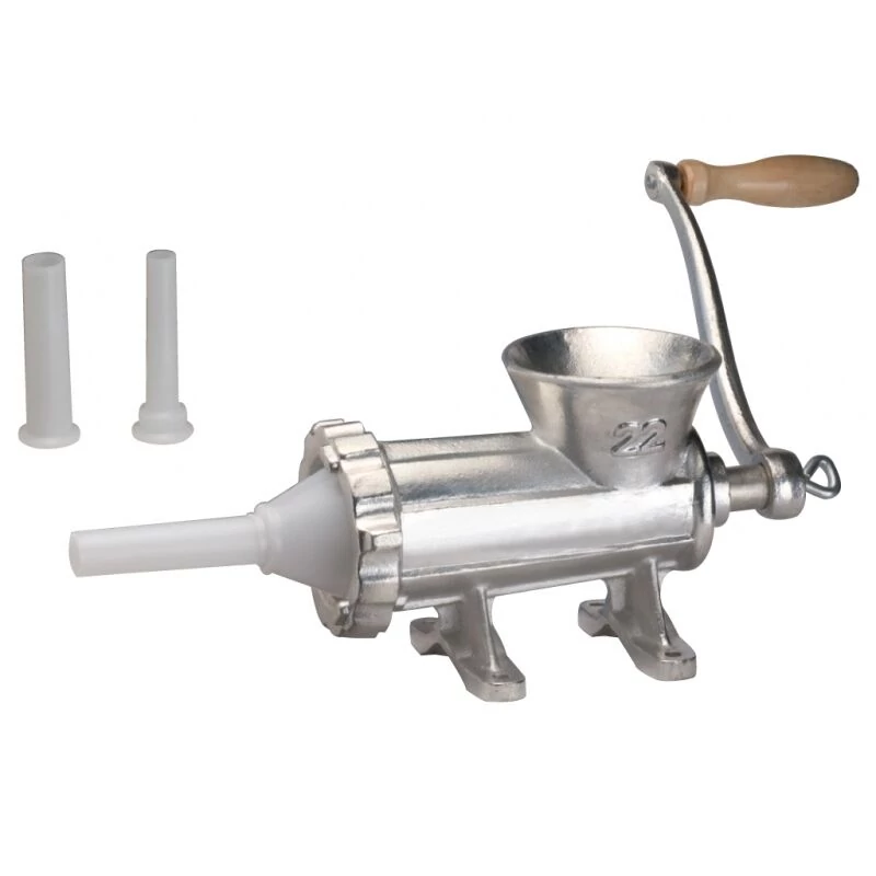 A 32-es húsdaráló kiváló választás azoknak, akik kedvelik a házi kolbász- és hurkakészítést. Az öntöttvasból készült, strapabíró gépház mellett három különböző átmérőjű hurkatöltő cső segíti a tökéletes töltési élményt (2,2 cm / 2 cm / 1,6 cm).