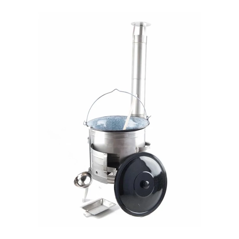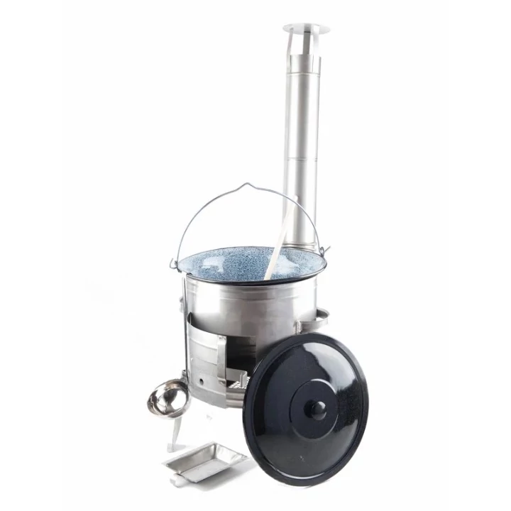 A zománcozott felület klasszikus megjelenést biztosít, könnyen tisztítható és strapabíró. A csomaghoz tartozik egy rozsdamentes fedő, merőkanál és egy fakanál is, valamint füstcső, könyök, kupak és hamutartó, amelyek segítenek a füst elvezetésében és tisztán tartani a főzőteret.