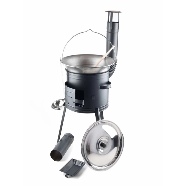A 39 cm átmérőjű, hosszú lábú bográcsház és a 16 literes natúr vasbogrács kombinációja ideális választás családi vagy baráti összejövetelekhez, rendezvényekhez. A készlet minden fontos kiegészítőt tartalmaz: füstcsövek, könyök, hamutartó, kupak, fedő, merőkanál és fakanál is részei a csomagnak, így külön vásárlásra nincs szükség.