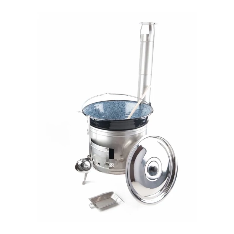 A szett része a füstcsőrendszer (2 db füstcső, könyök, kupak), valamint rozsdamentes fedő, merőkanál (270 ml-es) és fakanál is – minden adott a kényelmes, hagyományos hangulatú szabadtéri főzéshez.