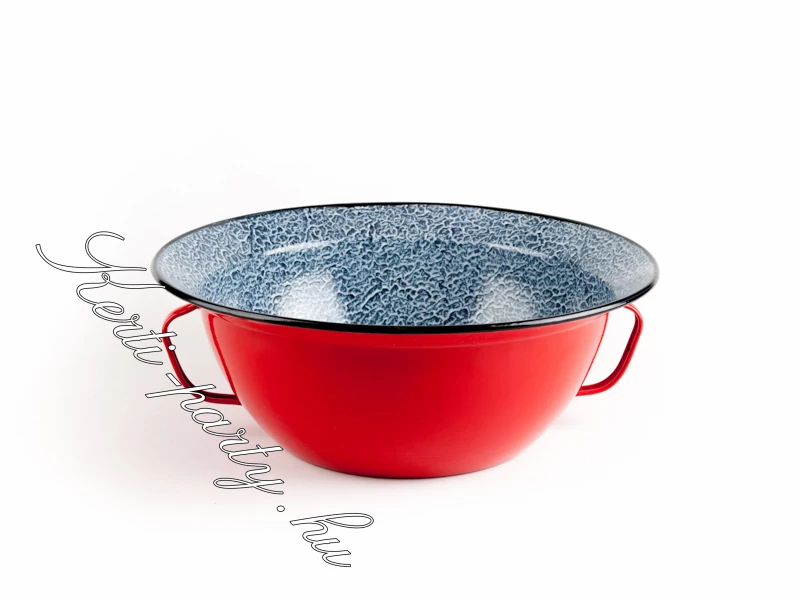 Bonyhádi vajling (medence) Űrtartalma: 4liter Ármérője: 34cm 1osztályú Magyar termék. Anyaga: belül cirmos, kívül piros zománcozott lemez. |