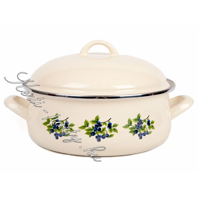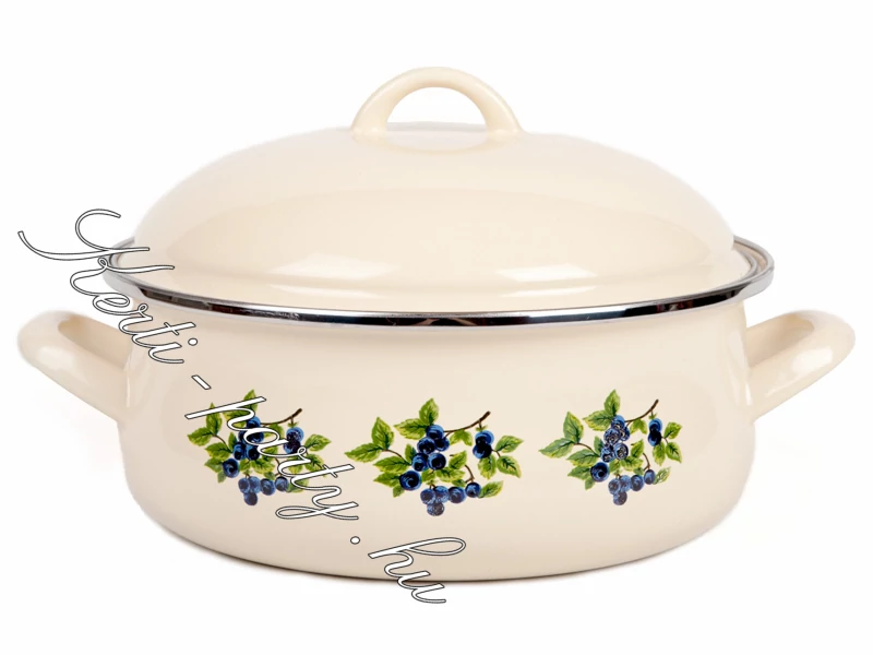 Kökény mintás zománcozott lábas20cm-es 2.5Literes 1.osztályú Magyar termék. Garantált minőség! Energiatakarékos fenék. Használható: minden fél tűzhelyen! Mosogatógépben mosható. Anyaga: zománcozott lemez. fém peremmel |