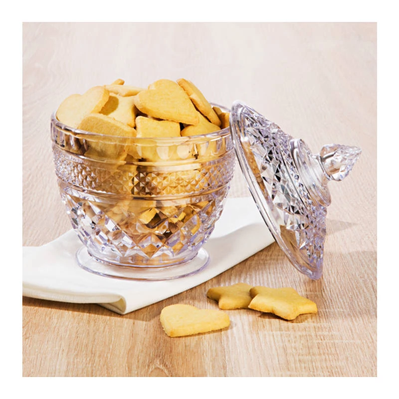 NOSTALGIA cukorkás tál tetővel 12cm A 12 cm átmérőjű NOSTALGIE fedeles műanyag tárolóedény nem csak sütemény, de sós csemegék felszolgálására is alkalmas. Anyag: Műanyag Magasság: 9,2 cm Átmérő alul: 8,5 cm Átmérő felül: 12 cm Súly: 150 gramm Tisztítás: semleges, folyékony mosogatószerrel, kerülje a karcolódást okozó tisztítószerek, és eszközök használatát! |