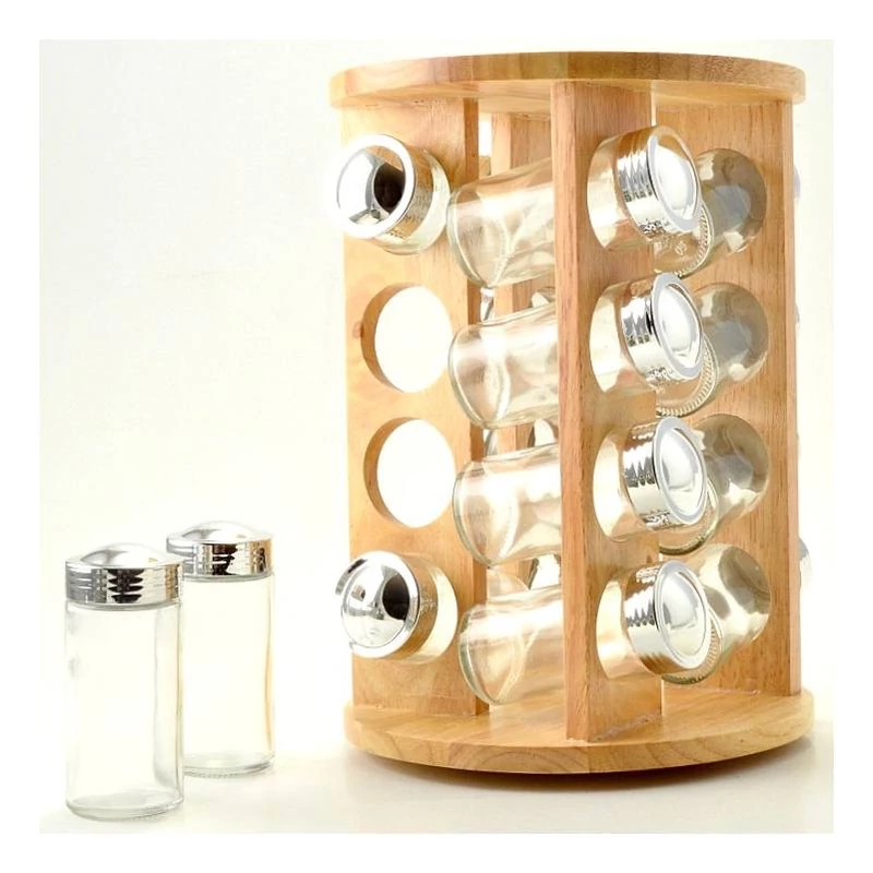 A 16 részes Brillante fűszertartó készlet tartalma: 16 db üveg fűszertartó krómozott felületkezelésű műanyag fedéllel, 1 db 16,5 x 16,5 x 30,3 cm-es forgatható fa állvány.