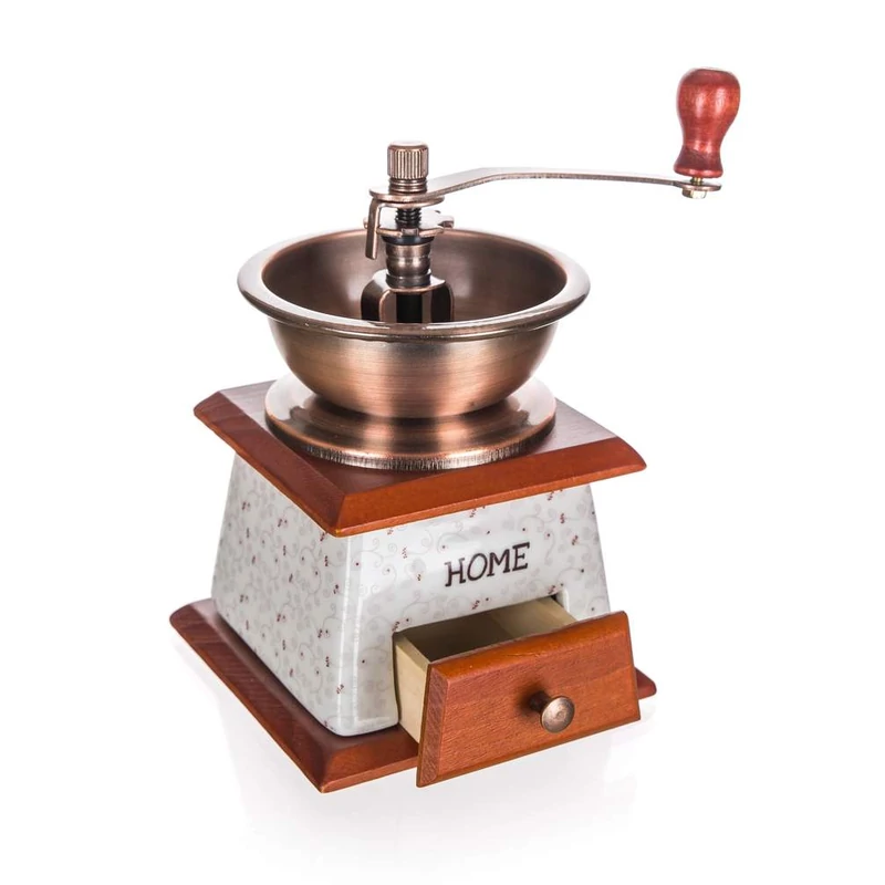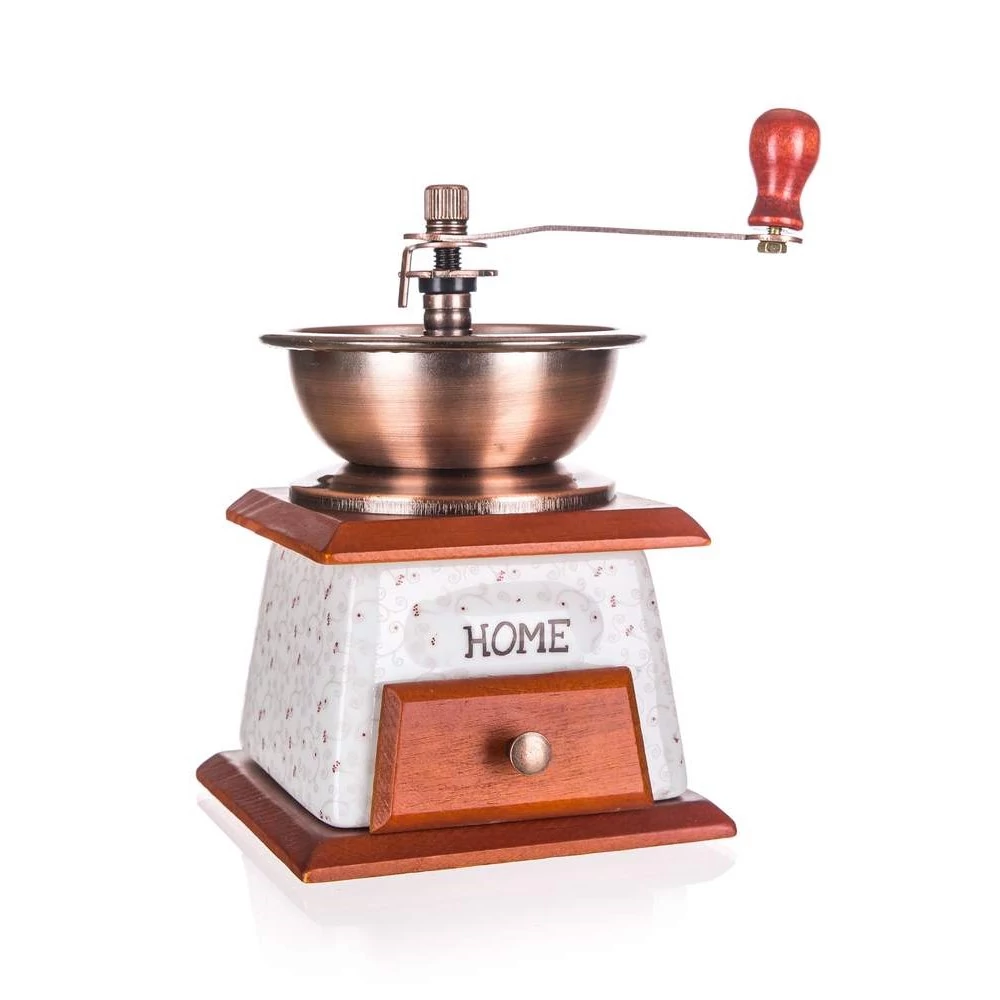 Kézi kávédaráló kerámia őrlőmechanizmussal, mutatós kerámia test fa kiegészítőkkel és fém kávébeöntővel, a kerámia őrlőmechanizmus a kívánt őrlési finomságnak megfelelően szabályozható.