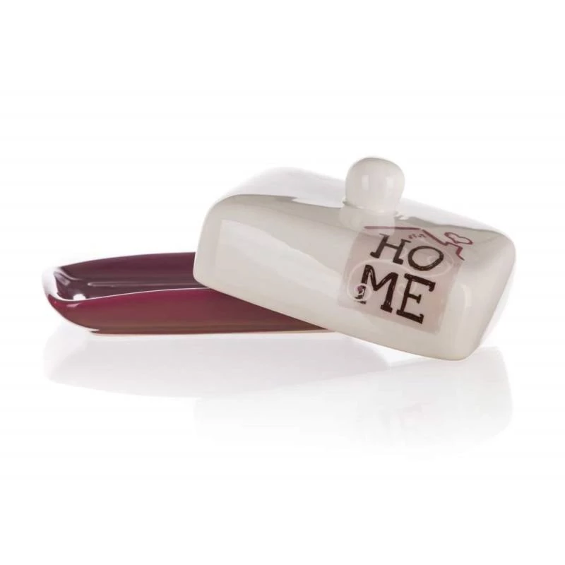 A fehér és szürke színű, HOME mintás vajtartó kerámiából készül.