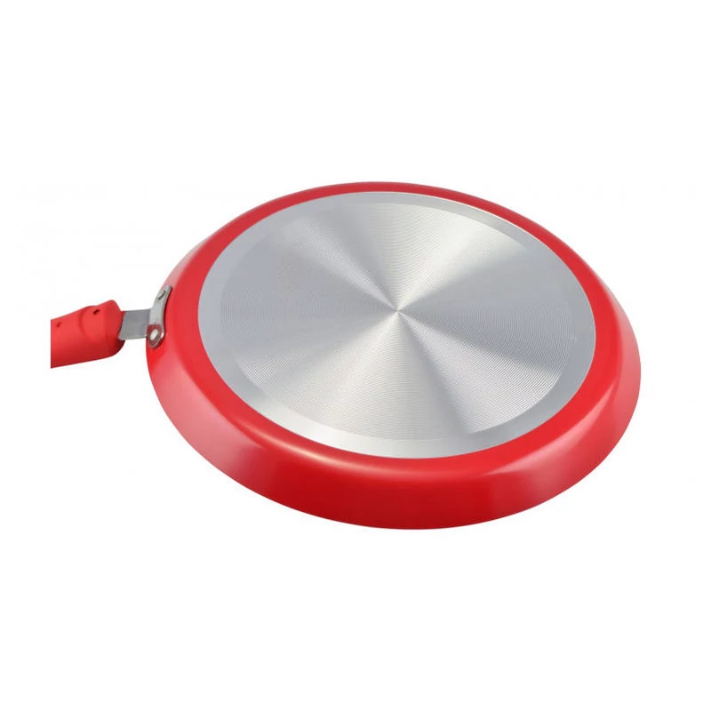 | Kerámia bevonatos palacsintasütő 28cm piros Anyaga: nemtapadó kerámia bevonattal ellátott alumínium, műanyag Mérete: 28 cm átmérőjű, 2 cm magas Súlya: 495 g Színe: piros Használható: gáz-, kerámialapos -, elektromos-tűzhelyen egyaránt. Tisztítása: Semleges folyékony mosogatószerrel mossa el! Kerülje a karcosodást okozó szerek és eszközök használatát! Kerámia bevonatos edények: az égetett kerámia réteg biztosítja a tapadásmentességet, ami ásványi anyagokból készül, teljesen teflon és szilikonmentes. A teflonnal ellentétben magas hőfokon sem távoznak káros anyagok, a bevonat pedig nem válik el az edény falától, nem hólyagosodik. | |