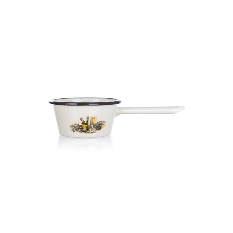 12 x 6,3 cm méretű zománcozott LAVENDER nyeles lábas kiöntővel, 0,8 mm vastag lemezből készül, belül 2 rétegben zománcozott és külső bevonata LEVANDULE motívummal díszített, pereme visszahajtott.