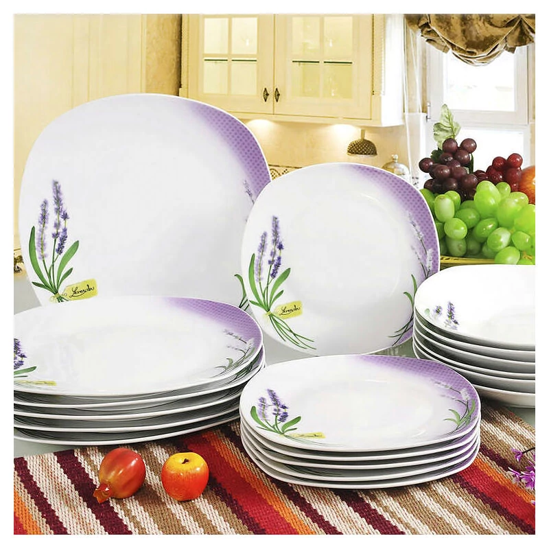 18 részes porcelán tányérkészlet, Levendula A 18 részes LAVENDER square tányérkészlet tartalma: 6x desszertes tányér A tányérok mikrohullámú sütőben használhatók és mosogatógépben moshatók. Anyaga: porcelán |