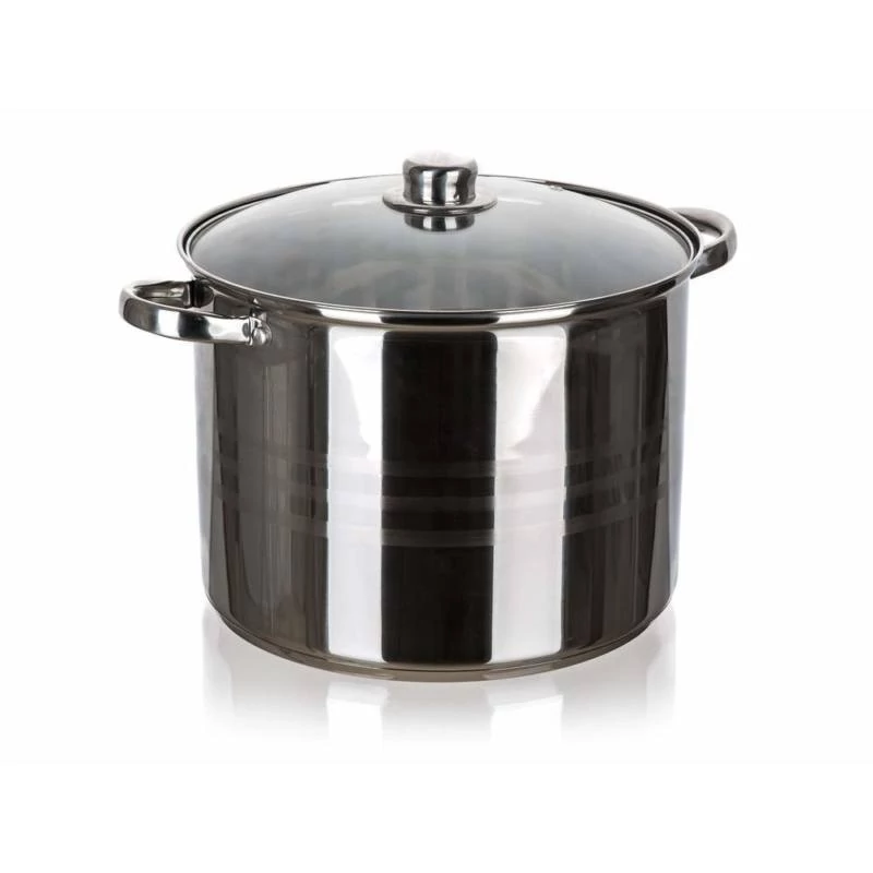 LIVING rozsdamentes acél fazék 16,2 l, üveg fedő, rozsdamentes acél fülek és fogantyú, fényes külső és belső felület, külső felületen három matt csíkkal.