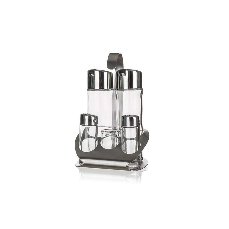 CULINARIA ízesítő készlet 6 db, háztartási és vendéglátó-ipari felhasználásra is alkalmas. Tető: rozsdamentes acél 18/8, PP műanyag és szilikontömítés, acél vastagsága 0,40 mm, tárolók: üveg, állvány: rozsdamentes acél 18/0, alap: 1,00 mm, fogantyú 1,5 mm.