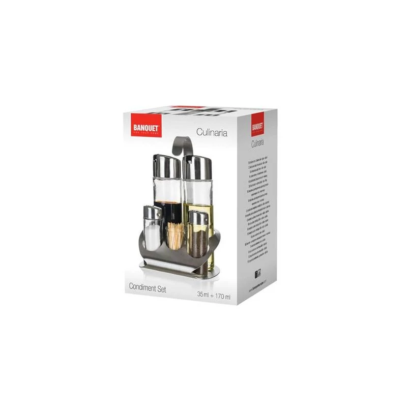 Ízesítő szett CULINARIA, 6db CULINARIA ízesítő készlet 6 db, háztartási és vendéglátó-ipari felhasználásra is alkalmas. Tető: rozsdamentes acél 18/8, PP műanyag és szilikontömítés, acél vastagsága 0,40 mm, tárolók: üveg, állvány: rozsdamentes acél 18/0, alap: 1,00 mm, fogantyú 1,5 mm. Kiváló segítőtársak saláták, tésztafélék készítéséhez, sütéshez, rántáshoz, grillezéshez. Készült első osztályú rozsdamentes acélból és fokozottan ellenálló műanyagból. Tisztítása: semleges mosószeres vízzel. Kerüljük a karcolódást okozó szereket.