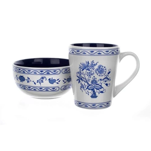 ONION reggelizőszett 2 részes A kétrészes ONION reggeliző készletet egy 360 ml űrtartalmú bögre és egy 13 átmérőjű tálka alkotja. A készlet hagyományos hagymamintás díszítésű kerámiából készül. Bögre: Átmérője:9.1cm , füllel:12cm Magassága:10.5cm Űrtartalma: 360ml Müzlis tál: Átmérője:13.3cm Magassága:6.7cm Űrtartalma:540ml Súlya a termékeknek , díszdobozban: 850 gramm Szín: Fehér / kék | Mikrósütő: Igen | Mosogatógép: Igen |