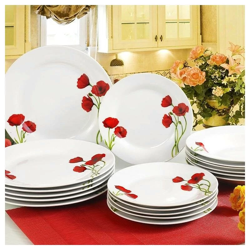 Stílusos, pipacs mintás 18 részes porcelán tányérkészlet – ideális választás mindennapi étkezésekhez vagy különleges alkalmakhoz is. |
