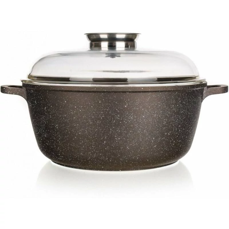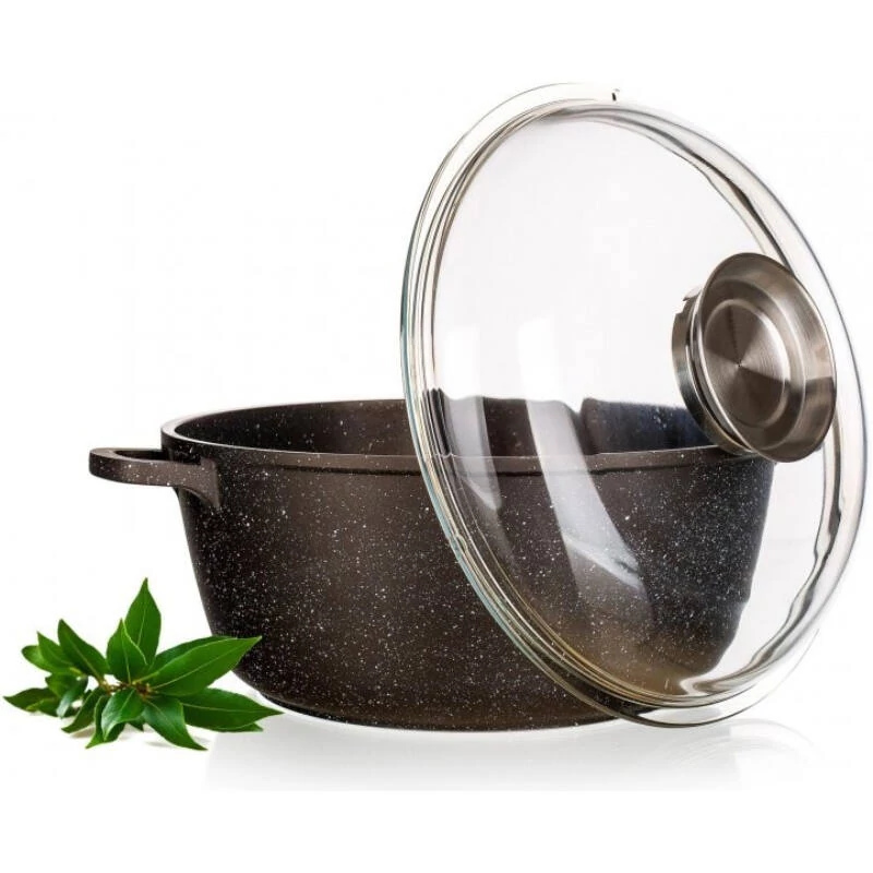 Alumínium öntvény fazék üveg termo fedővel és aroma fedőfogantyúval, PREMIUM DARK BROWN tapadásmentes bevonattal, méret 28 x 12,5 cm, barna gránit minta, falvastagság 2,2 mm, teljesen indukciós talp.