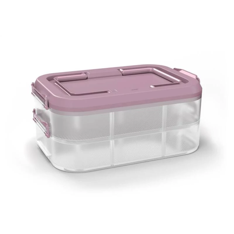 A parti doboz 2 tárolópadlót, fogantyúkat és átlátszó fedelet tartalmaz.